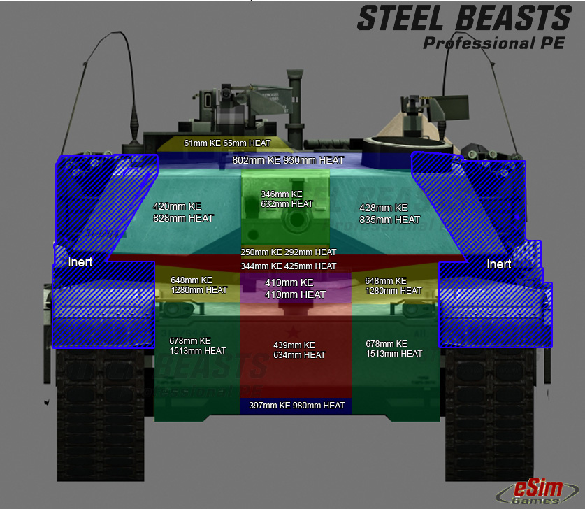 الأسهم الحمراء تركز على الموضع الخلفي للدبابة حيث يكمن المحرك وناقل الحركة ، بالإضافة إلى برميلي تخزين وقود في مؤخرة الهيكل بسعة إجمالية من 390 لتر . وتذكر دائماً وأنت تواجه هذه الدبابة أن القاعدة الرئيسة في قتال الدبابات بصفة عامة تتحدث دائماً عن "شاهد هدفك أولاً ، أطلق النار أولاً ، أحرز إصابتك أولاً" . هذا الموضع من الدبابة يمكن استهدافه بقنابل المولتوف (ستكون النتائج مجزية إن شاء الله) وليس بالضرورة بالمقذوفات الصاروخية المضادة للدروع .. إن الطريق الأخرى الأسهل لتعطيل دبابة معركة رئيسة (باستثناء ضربة مباشرة في منطقة ضعيفة بسلاح مضاد للدبابات) أن تستهدف الجنازير لتسجيل ما يطلق عليه "قتل الحركة" mobility kill ، أو استهداف جميع تجهيزات الرؤية البصرية الخارجية ، فالدبابة عندما تتعطل وتتوقف عن الحركة تسهل آلية تحطيمها .