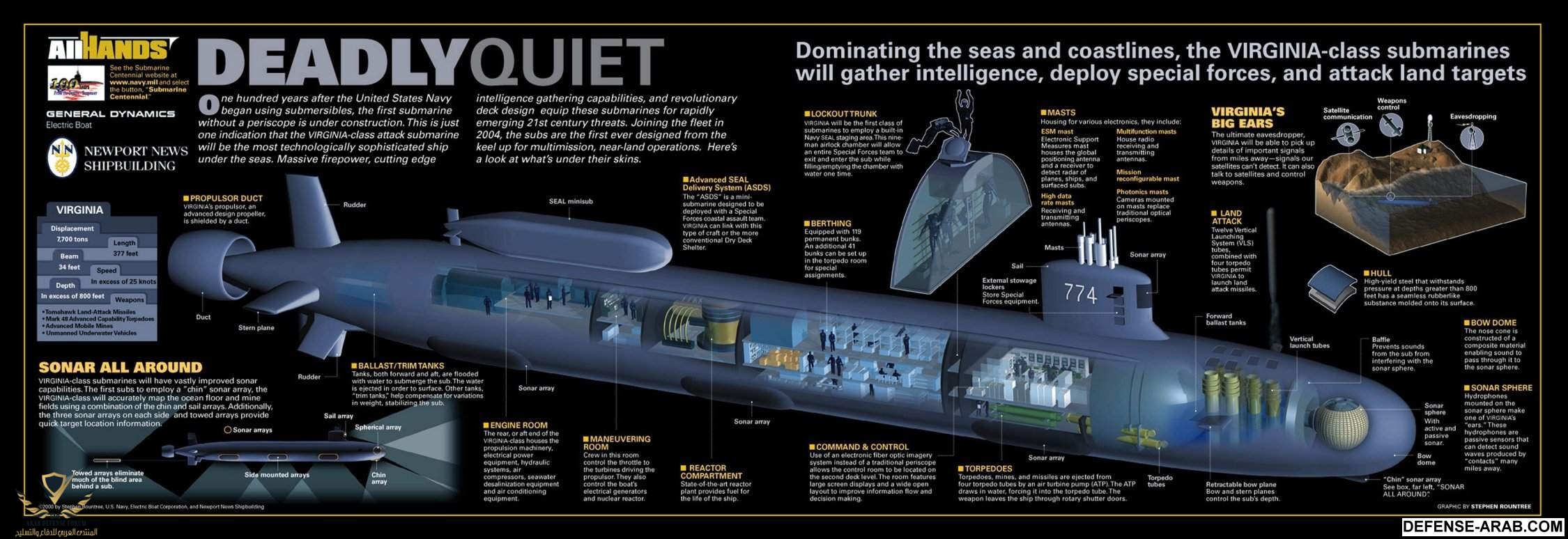 - الغوَّاصَة النَّوَوِيّة الأمرِيكِيَّة Virginia SSN ، سِعرُهَـــــا : 2.4 مِليَار دُولاَر {النّمُوذج الأوَّل} وحالِيًّا 1.8 مِليَار دُولاَر