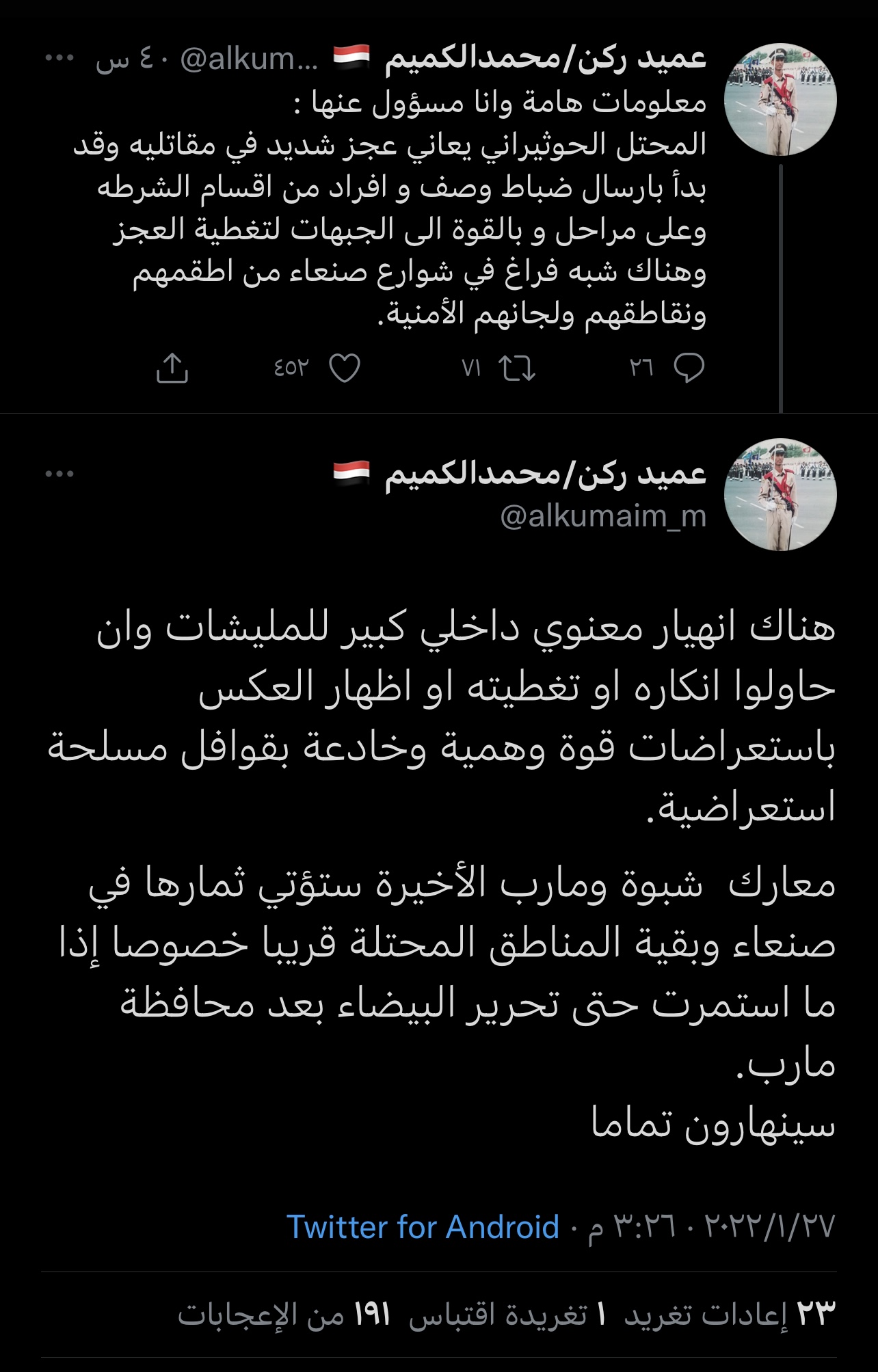 أخبار متداولة بين إخواننا.. بأنهُ تم رفض مشاركة القيادي المسمى (بالشريف) و المنتمي لجماعة الإخوان (الإصلاح) ومن معه من قبل ألوية العمالقة.. وتم قبول مشاركة الشيخ القبلي المرادي وجماعته.