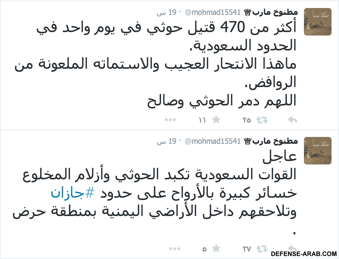 المرصد اليمني @MrsdYem 38 ثقبل 38 ثانيةاخي العزيز اشكرك على الرد وانا اعرف الكذب الي يروجون له الحوثيين وعفاش وكذلك الزملاء في المنتدى ولاكن هناك أناس قد يتأثرون من هذه الأكاذيب ولا تنسى اخي العزيز ان للإعلام دور في التأثير النفسي وهذا مايجب أن يتم استخدامه على الحوثيين واتباع عفاش ومن يؤيدهم من الشعب اليمني وأخص قبائل الشمال ومدى ماخسروه والضعف الذي أصبحوا فيه وذلك لتقل الروح المعنويه لهم ويبحثوا عن السلام في آخر الامرياخي نحن دولة صادقه وواضحة وارضنا لم ياطاءها قدم عفريت تريدنا ان نصبح أضحوكة مثل الحوثيين احتلينا نجران وجيزان هل قرات بعض ما كتبوا نحن الان نحاصر مطار نجران والجنود السعوديين فروا من امامنا ؟؟؟؟يا اخي قواتنا في بعض المواقع محتله 30 كيلو متر من الأراضي اليمنبه ولم نظهر على اعلامنا هذا الكلام لأننا دولة تعرف متى تعلن وكيف تعلن والهدف واضح وهو إعادة الشرعية لليمن وطرد الحوثيين وتسليم السلاح لدولة اليمنية ولو كان هدفنا احتلال اليمن واجتياح المدن وليس موقع به 7 عسكريين أقول مدن بأكملها لاحتليناها خلال ساعات باذن واحد احد ولكن اليمنيين اخوة لنا وكل قصف يحصل هو لتدمير مقدرات الحوثيين واتباع عفاش ولكن الشعب اليمني للأسف الشديد اصبح رهينه لهؤلاء المرتزقة .