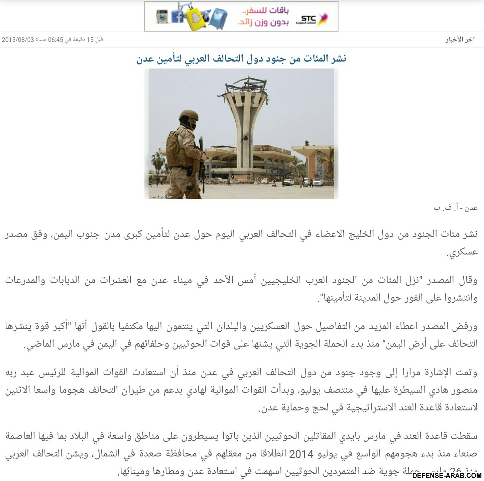 أفادت مصادر إعلامية من مدينة عدن "بجنوب اليمن" ان المدينة شهدت خلال الساعات القليلة الماضية اكبر عمليات انزال لجنود عرب ومعدات عسكرية ثقيلة من قبل قوات التحالف العربي الداعمة لهادي وحكومته .. وذكرت المصادر ، ان قوات التحالف قامت بعمليات إنزال لمعدات عسكرية ضخمة الاحد بالاضافة الى نشر 3000 الف جندي بمعداتهم الثقيلة لتأمين المدينة، والمساعدة في عمليات عسكرية في أبين ولحج القريبتين من عدن كي تتمكن الحكومة والرئيس هادي من العودة الى عدن .