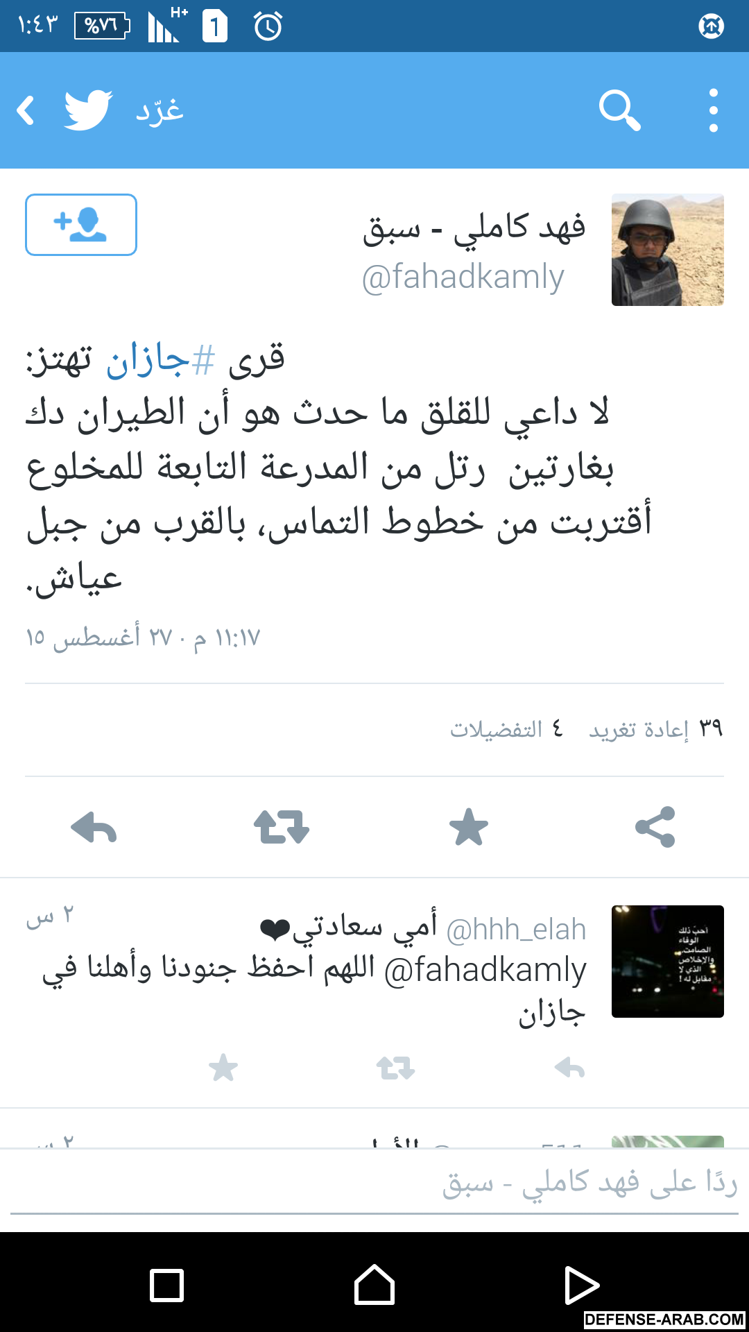 المغرد "سعود مطنش" قال: "قبلة على رأس كل جندي وضابط على الأرض أو في السماء أو في البحر، ففخرنا بكم يصل عنان السماء".