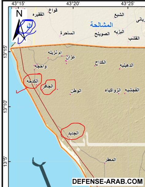 كل المناطق بالازرق سيطرت عليها قوات الشرعية ابتداء من ذو باب حيث عملت دائرتين ازرق ومعسكر العمري في الجبل وحوله ثم المعقر ثم الجديد والكدحة وواحجة المخا حيث الدائرة الحمراء اخر شي والحد الفاصل هو بين مديرية المخا وذوباب