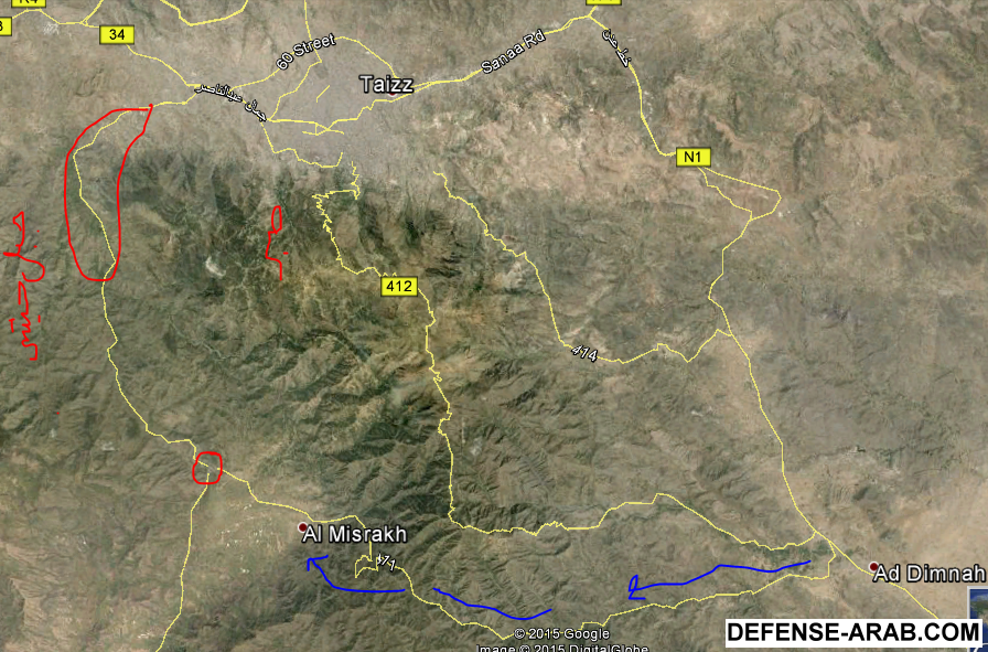 تعزيزات الحوثي جاءت من كرش والمسيمير من لحج لانها تسيطر عليها وعلى الطريق الى هذه المدينة والى منطقة حوبان على طريق مطار تعز الدولي.