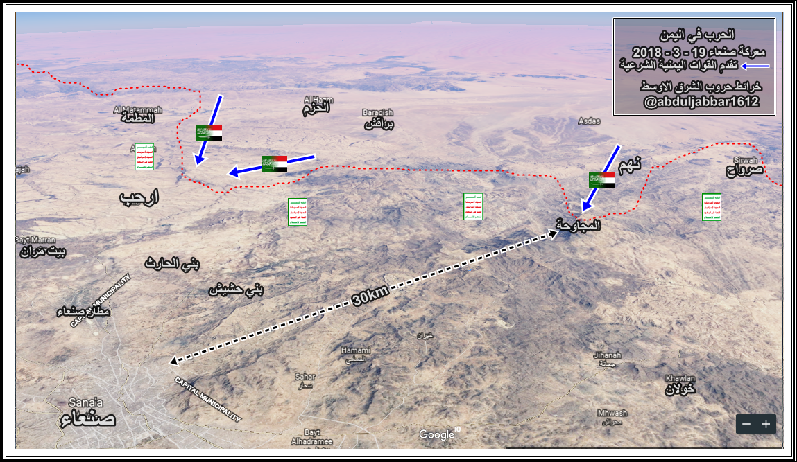 القوات اليمنية الشرعية ( الرئيس هادي ) تصل منطقة المجاوحة على جبهة نهم شرق العاصمة صنعاء 30كم
