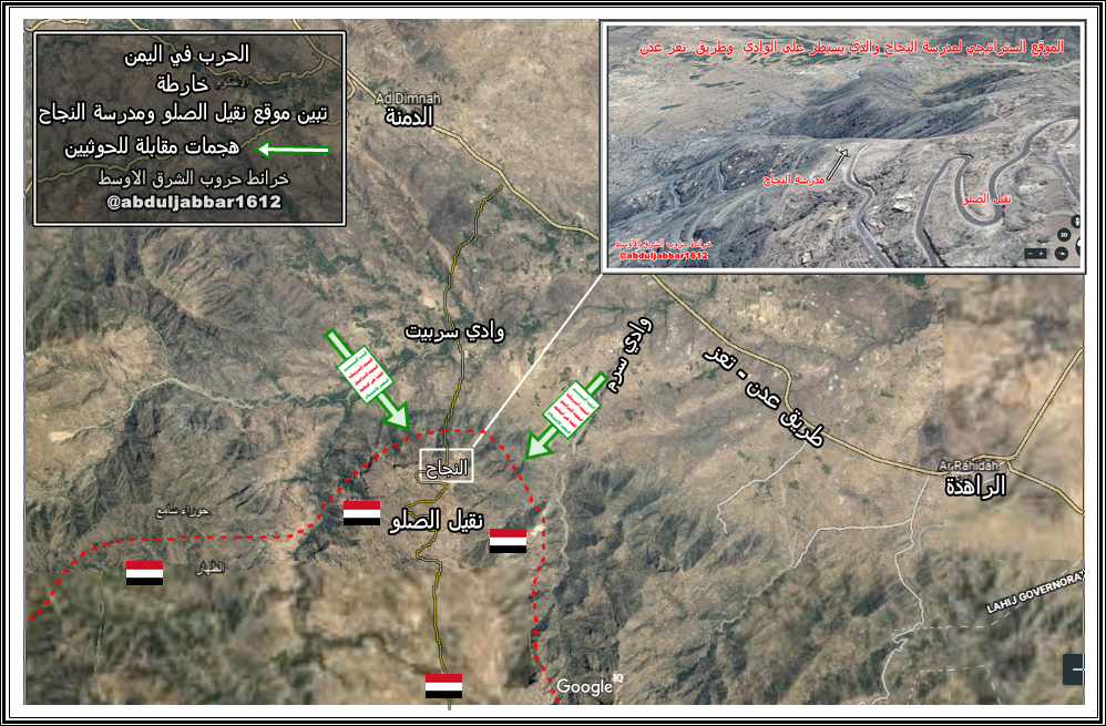 مدرسة النجاح الثانوية في مديرية الصلو محافظة تعز اكثر مدرسة تردد اسمها في الحرب اليمنية لماذا ؟ نقيل الصلو هو طريق جبلي وعر يربط بين طريقي تعز - عدن الشمالي والجنوبي ومع تقدم النقيل شمالا تجاه الدمنة ينحدر تجاه وادي يفصل بين نقيل الصلو والدمنة وطريق تعز عدن هو وادي سربيت والمنطقة المشرفة على الطريق والوادي هي المنطقة المرتفعة التي تقع فيها مدرسة النجاح وبعد سيطرة القوات اليمنية الشرعية عليها سيطرة بالنار على طريق تعز - عدن لذلك شن الحوثيين عدة هجمات مقابلة لاستعادة المدرسة والنقيل ولكنها لم تفلح في ذلك لحد الان ولااعلم ماهو السبب الذي اوقف القوات اليمنية الشرعية عند حافة النقيل ولم تديم الزخم تجاه طريق تعز - عدن والدمنة بالرغم من الهيمنة الجوية لطيران التحالف وكذلك موقع النقيل والمدرسة المشرف على المنطقة برمتها ؟