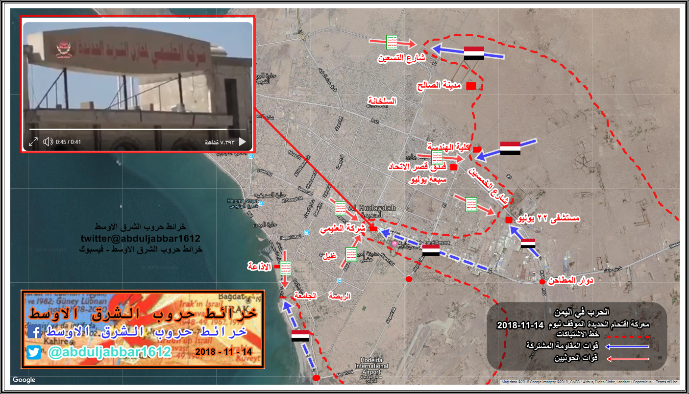 نشرت الوية العمالقة اليوم فديو تظهر فيه ان قواتها وصلت الى قلب الحديدة وبالتحديد الى شركة العليمي . واذا كان هذا الفديو صحيح سيكون الموقف في الحديدة كما مبين في الخارطة ادناه .