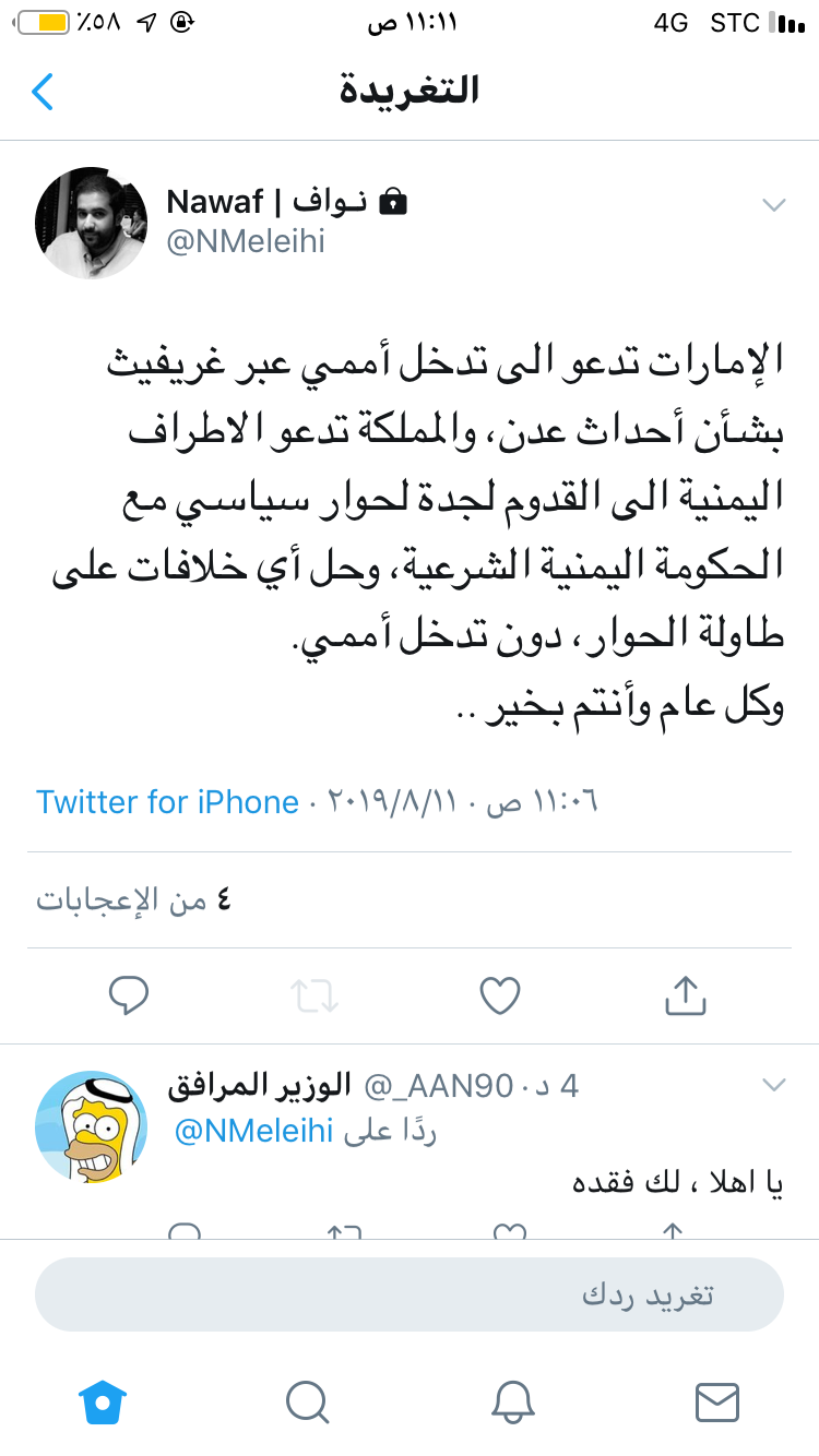 انت تدعم الجنوب شي يرجع لك لكن المملكة تدعم يمن كامل يقوم ببعضه و لا يصبح جزء منه عالة و منبع لمليشيات إيران .