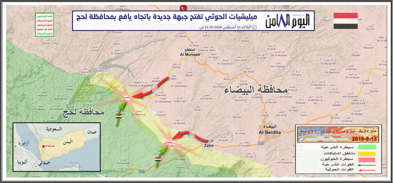 بعد تداعيات معركة عدن واحتمال سحب بعض القوات من جبهات الضالع ولحج القوات الحوثية تشن هجوم واسع انطلاقا من البيضاء تجاه يافع وبالاخص منطقة السر وريشان وجبل صبر . الخبر نقلا عن ( اليوم الثامن @alyoum8th )