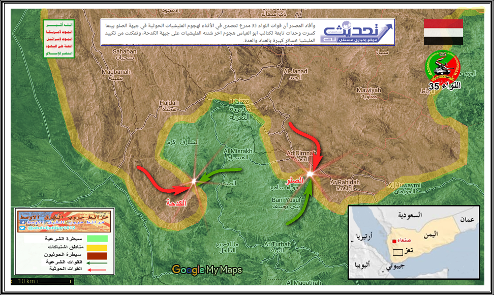 القوات الحوثية تشن هجمات متفرقة من جبهة الدمنة - الصلو وجبهة الكدحة جنوب تعز والقوات الشرعية المتمثلة باللواء 35 مدرع وكتائب ابو العباس تقول انها تصدت للهجمات . الخبر نقلا عن ( @TAHDEEtHNet )