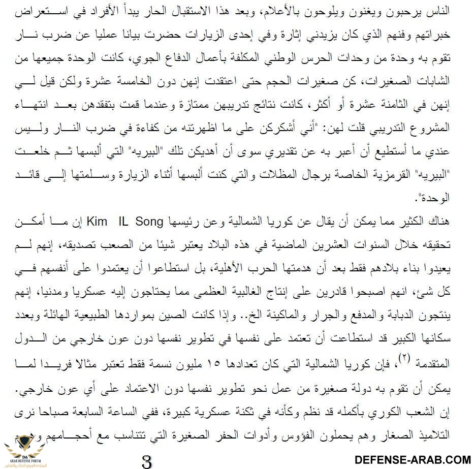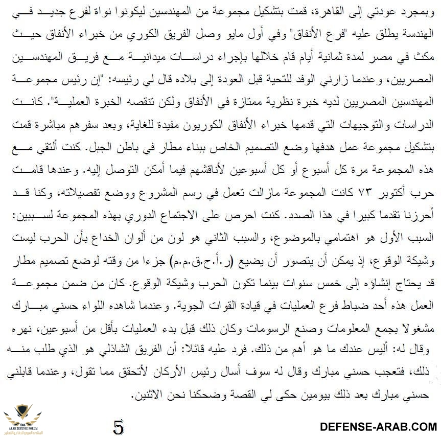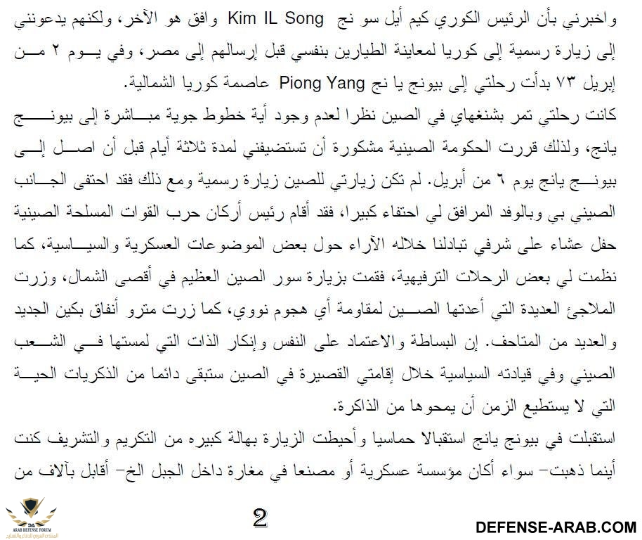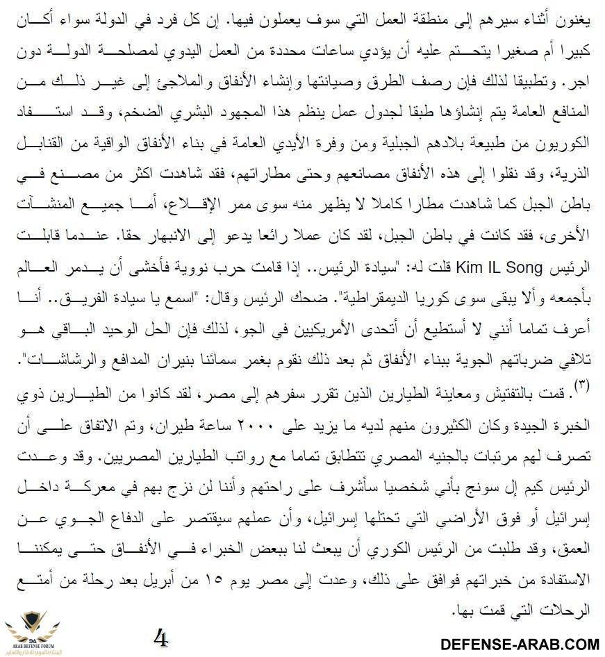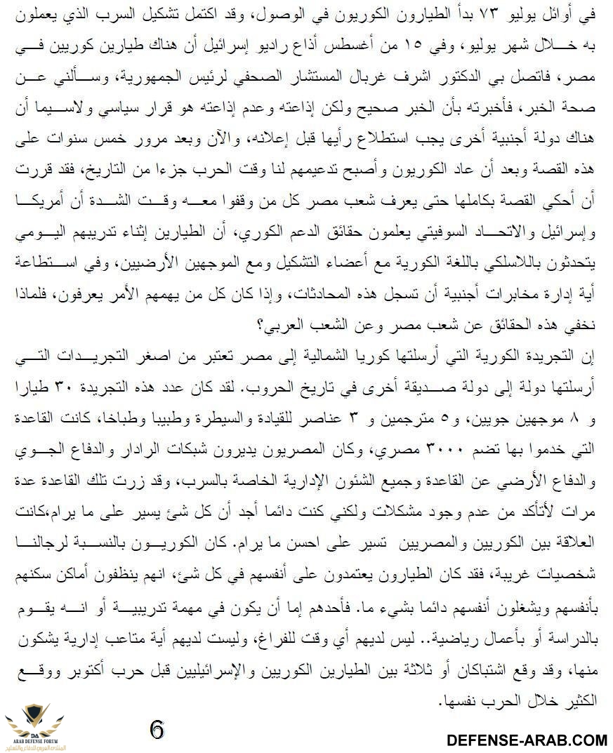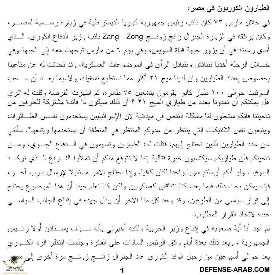 ”اتجهت في الاول من نيسان ( أبريل ) في زيارة رسميه الى الرئيس كيم سونج. من اجل الاتفاق على مساعدتهم لنا…. طيارون كوريون. جميعهم من ذوي الخبرة. لأغلبهم اكثر من 2000 ساعة طيران. وصلوا لمصر في ايار (مايو ) وبدأوا العمل في تموز( يونيو) . الاسرائيليون او حلفائهم اكتشفوا محادثاتهم في اللاسلكي. وفي 15 من اب اعلنوا وجودهم.”