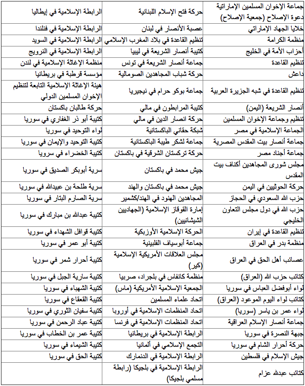 كذلك تضم اللائحة تنظيمات الإخوان المسلمين، وفي مقدّمها الفرع الإماراتي "الإصلاح"، ونحو 23 تنظيماً مسلّحاً في سورية، بعضها مرتبط بجبهة "النصرة"، وبعضها الآخر بتنظيم "الدولة الإسلامية" (داعش)، إضافة إلى تنظيمات موالية لإيران في العراق والخليج العربي. وشملت اللائحة تنظيمات وجمعيات مسلّحة وإغاثية في باكستان وتونس والصومال ونيجيريا ومالي والهند، إضافة إلى أخرى في دول أوروبية وأميركية.