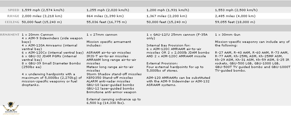 طبعا لا يوجد شي يمكن ان قارنها بها ليكون هناك توازن حتى تأتي الباك فا و ان كانت بعض الجوانب المتعلقة بها تتكلم عن طائرة خارقة تتفوق على الرابتور في بعض الميزات الى انها أقل من الرابتور في ميزات .