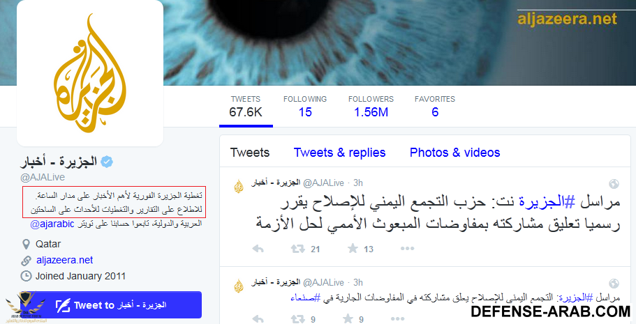 فتى الوطن قال: مافهمت قصدك يالعربي أنقر للتوسيع... اقصد ان الجزيرة (القطرية) متواطئة مع داعش وداعش تقوم بتهديد الخليج بتمويل قطري المكتوب بالمربع الاحمر يجعلها من المفترض ان تنقل كل الاخبار ومنها خبر الضربة على داعش لاكنها لم تنقلها لماذا ؟
