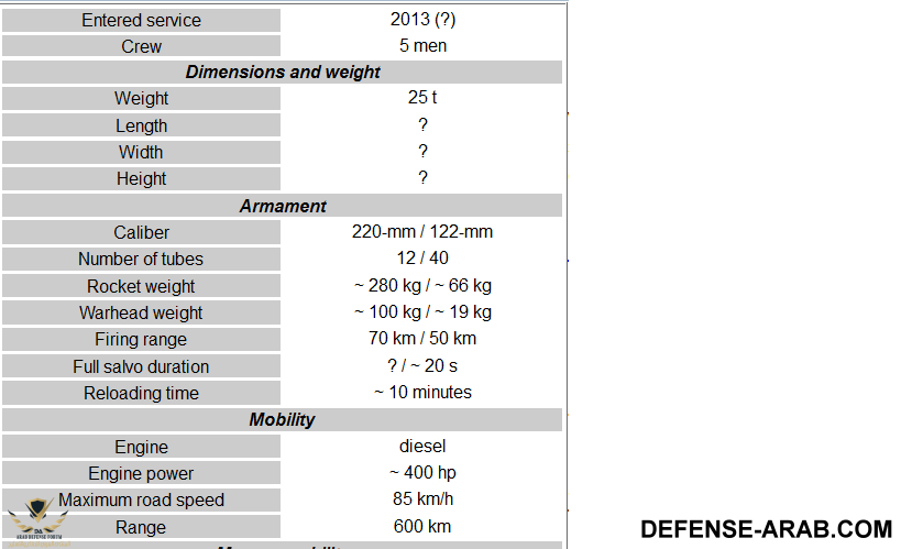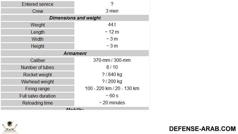الراجمتان يستطيعان إطلاق صواريخ موجه ال AR3 تطلق صواريخ موجه عيار 370mm يصل مداها من 100 كلم إلى 220 مع نسبة خطئ لا تتجاوز 50 متر حسب الخبراء يمكن اعتبار صواريخها ك صواريخ باليستية قصيرة المدى اما صواريخ عيار 300mm يصل مداها من 70 إلى 130 كلم راجمة AR3/2 تمتلك تشكيلة واسعة من الرؤس الحربية من المضادة للأفراد للدبابات وحتى رؤوس لنشر ألغام إلى جانب الرؤوس الحربية المعروفة ويشغلها 3 أفراد يمكن أن يجهزوها للإطلاق في 5 دقائق واعادة التلقيم في 20 دقيقة ويمكنهم إطلاق الصواريخ دون مغادرةالمقصورة ويمكن للراجمة أن تغادر موقعها في دقيقة أيضا الراجمة مدعومة بشبكة اتصال قوية متصلة ب الأقمار الإصطناعية كما تمتاز AR3 /2 بطائرة بدون طيار للإستطلاع و توجيه الصواريخ