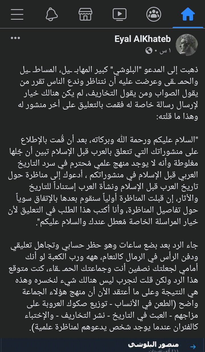 البلوشي تحداه الباحث في تاريخ عرب ما قبل الإسلام إيال خطيب في مناظرة امام الكل عن عروبة فلسطين قام رد ببلوك 😂