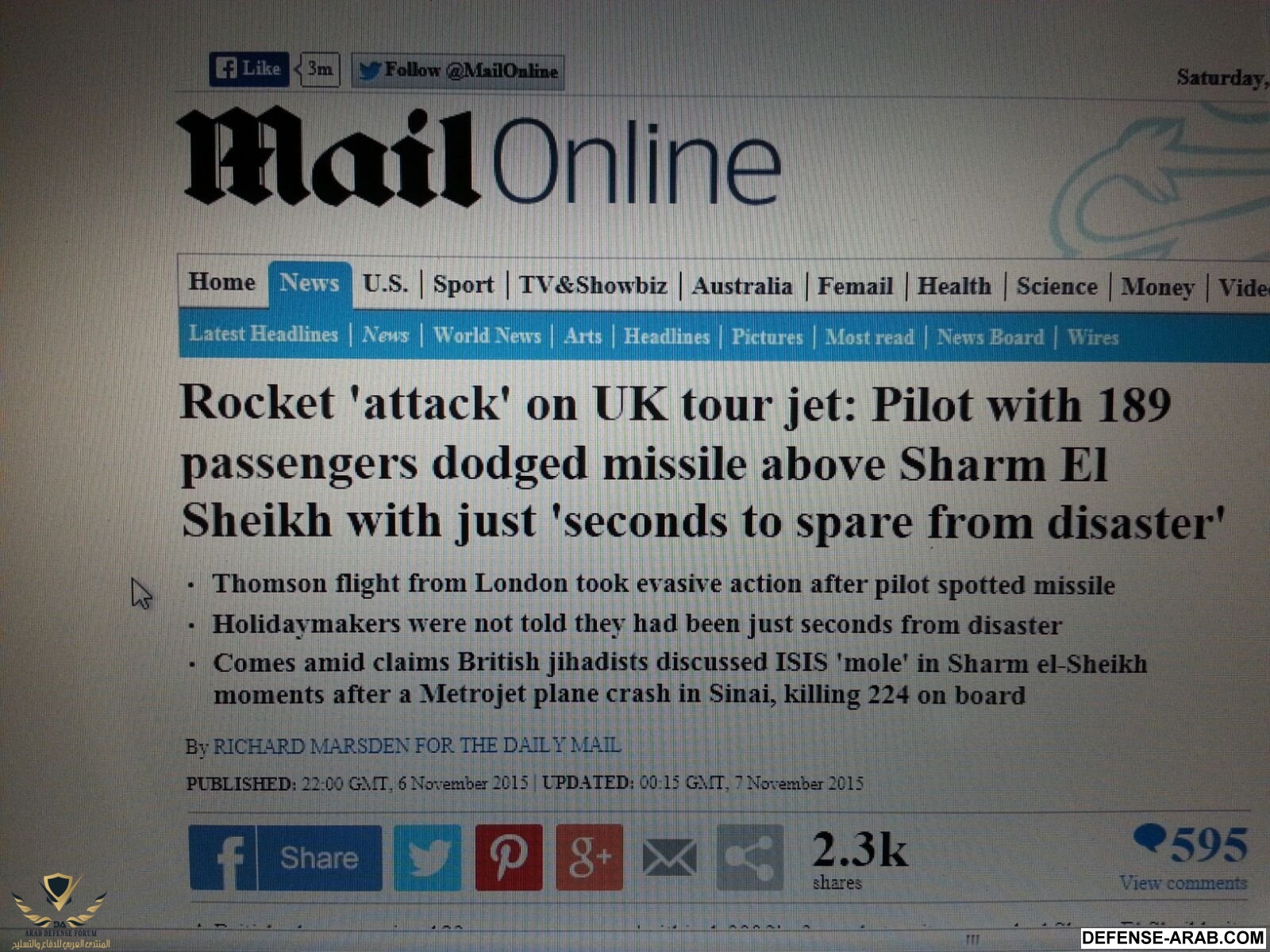 في سياق حملة التحريض التي تقودها بريطانيا ضد مصر ، ومع انكشاف مخطط لندن لترويج مزاعم حول قدرة ما تسمى ولاية سيناء على إسقاط الطائرات في سيناء، زعمت وزارة النقل البريطانية o_O، أن طائرة تابعة لخطوط "طومسون" الجوية البريطانية، تمكنت من النجاة من هجوم صاروخي :confused: أثناء تحليقها على ارتفاع ألف قدم فوق مدينة شرم الشيخ :mad:، قبل شهرين من وقوع حادث تحطم الطائرة الروسية بشبه جزيرة سيناء، بعد تمكن الطيار من تفادي الصاروخ بشكل سريع o_O.