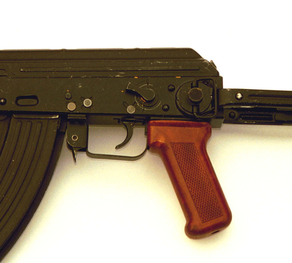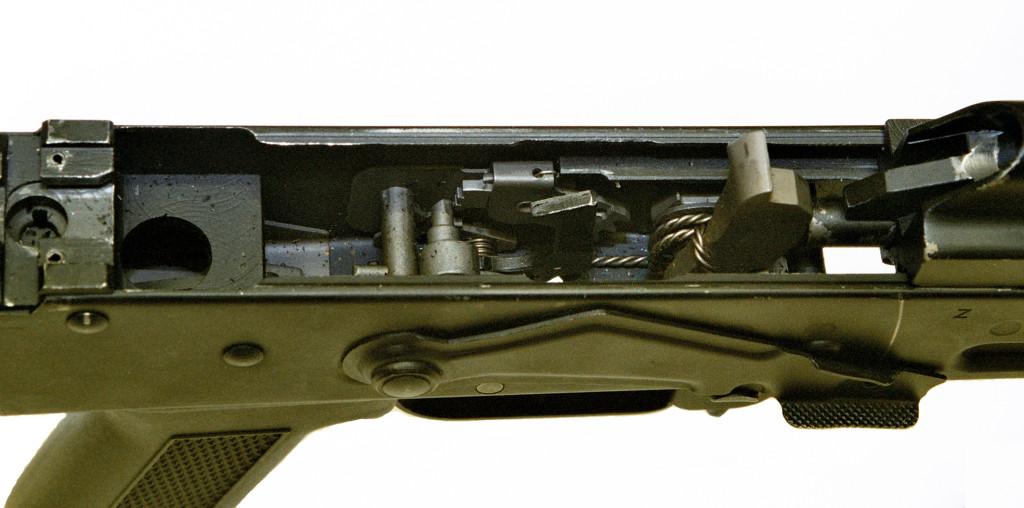 صورة لداخل آلية إطلاق النار في البندقية يلاحظ غياب مؤخر الطارق و وجود آلية الصليات الثلاثية إلى الجهة اليسرى من البندقية
