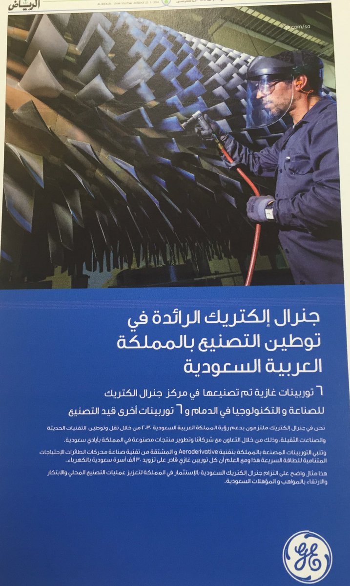 بدوره قال مازن البهكلي، نائب الرئيس لعلاقات العملاء الاستراتيجيين لدى “جنرال إلكتريك” في المملكة العربية السعودية: “نحن ملتزمون ببذل كل جهد ممكن نحو تعزيز عمليات التصنيع المحلي للمعدات الصناعية المتكاملة في المملكة، بما ينسجم مضموناً وأهدافاً مع رؤية السعودية 2030 بهدف تطوير الإمكانات الصناعية وتوفير الفرص المهنية المثمرة وتفعيل دور المشاريع الصغيرة والمتوسطة. كما نثق أيضاً بالقيمة الكبيرة التي يحققها توطين العمليات الصناعية على المدى الطويل، بإدارة الخبراء السعوديين، مما يضع أسساً قوية لمبادرات تصنيع جديدة تضطلع بها ’جنرال إلكتريك‘ في المملكة العربية السعودية”.