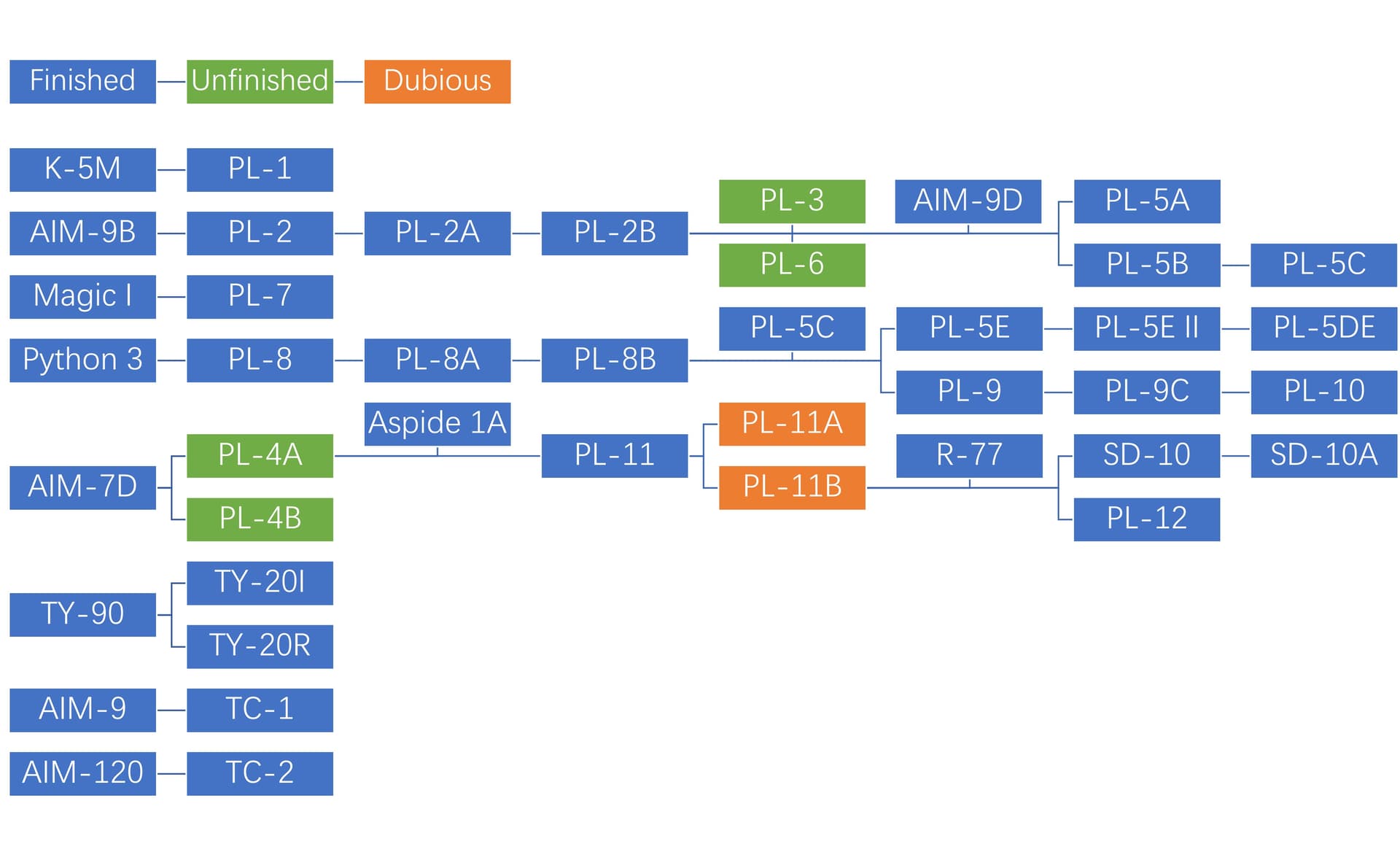 على الرغم من انهيار العلاقات بين الصين والاتحاد السوفيتي في يونيو 1960، إلا أن السوفييت وفوا بوعدهم في عام 1961 وقدموا للصين صواريخ K-13 والرسوم البيانية لها. استغرق الأمر حوالي عقد آخر لبدء الإنتاج الكثيف للنموذج الصيني من النسخة السوفيتية من صاروخ Sidewinder، تحت اسم PL-2.
