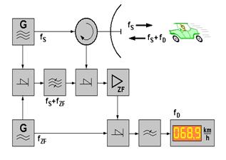 أما سرعة الأهداف المتحركة فيمكن قياسها باستخدام تأثير دوبلر (Doppler effect) والذي مفاده أن تردد الموجة الكهرومغناطيسية المرتدة عن الهدف المتحرك قد يزيد أو ينقص عن تردد الموجة المرسلة بمقدار يتناسب طرديا مع مركبة سرعة الهدف باتجاه الرادار ففي حالة الزيادة فإن الهدف يقترب من الرادار وفي حالة النقصان فإنه يبتعد عنه. ومن الواضح أن سرعة الهدف لا يمكن تحديدها بشكل مطلق إلا في حالة واحدة وهي إذا كان الهدف يتحرك بشكل مباشر نحو الهدف أما إذا كان يتحرك بزاوية عامودية أو مائلة على الخط الواصل بين الهدف وموقع الرادار فإنه من غير الممكن تحديد السرعة المطلقة. ويمكن حساب سرعة الهدف المطلقة بشكل غير مباشر إذا ما تمكنت المعالجات الموجودة في الرادار من تحديد اتجاه سير الهدف والسرعة الشعاعية (radial velocity) التي تم قياسها من خلال رادار دوبلر. ويقوم جهاز موجود في مستقبل الرادار بمقارنة الترددين وإيجاد الفرق بينهما ومن ثم يتم احتساب السرعة الشعاعية بضرب فرق التردد بثابت معين يتم تحديده حسب الوحدات المستخدمة لإظهار السرعة كأن تكون كيلومتر في الساعة. ولا بد من التنويه أن حساب السرعة يكون صحيحا إذا كان الرادار ثابتا أما إذا كان الرادار من النوع المحمول فإن السرعة التي يقيسها للهدف هي السرعة الشعاعية النسبية وهي حاصل جمع السرعتين الشعاعيتين إذا كانا يقتربان من بعضهما وحاصل الطرح في حالة التباعد.