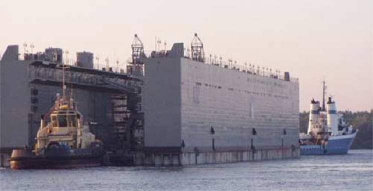 В завершающей стадии находится строительство плавдока композитного типа грузоподъемностью 25 тыс.т. Заказчик - Российская Федерация; назначение дока - утилизация подводных лодок.