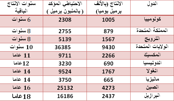 اعتمد في هذا الجدول على النشرة الاحصائية السنوية التي تنشرها منظمة البلدان المصدرة للبترول ، وهنا نلاحظ انه حتى بعض الدول التي تسجل نسبًا كبيرة في انتاج النفط ، مهددة بخطر نضوب الخام في المستقبل القريب.