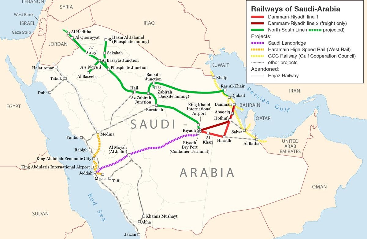 2- ويتضمن الخط الثاني تطوير خط السكة الحديدية بين الجبيل والدمام، وهو قيد الإنشاء أيضاً، وسيتطلب بناء 35 كيلومتراً من المسارات.