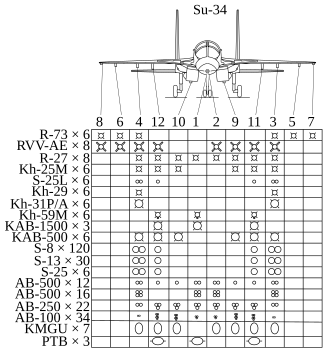 - Su-34M / Su-34 NVO ( ترقية معدات الملاحة والمعدات الخارجية ) - نسخة مُحدثة، تُعرف أيضًا باسم Su-34 Sych تم توقيع العقد الروسي في عام 2020 واستبدلت Su-34 الأساسية في الإنتاج. ووفقًا للتقارير، فإن هذه الترقية تؤثر بشكل خطير على جميع إلكترونيات الطيران الخاصة بالطائرة تقريبًا. تم تحسين أنظمة الرادار والرؤية والاتصالات. تم توسيع نطاق الذخائر الموجهة التي يمكن للقاذفة استخدامها بشكل كبير كما توسعت قدرات الحرب الإلكترونية مع إدخال نقاط تعليق جديدة