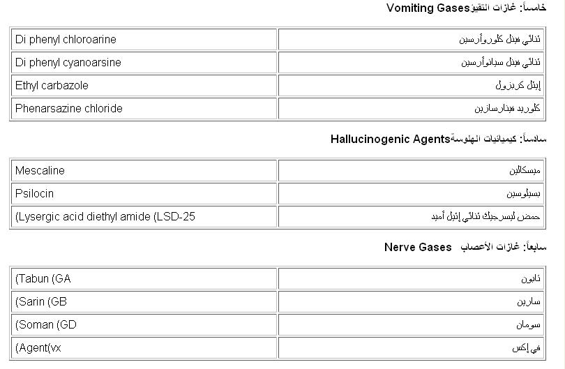 وتشمل غازات الأعصاب، وغازات الدم، وغازات الإزعاج، وغازات شل القدرة.