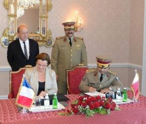 من اليسار إلى اليمين: جان إيف لو دريان، وزير الدفاع الفرنسي. باسكال سوريس، نائب الرئيس الأول للتنمية الدولية في شركة Thales. اللواء حمد بن علي العطية وزير الدولة لشؤون الدفاع؛ عبد العزيز فلاح الدوسري مساعد وزير الدولة لشؤون الدفاع للشؤون الفنية. (شركة Thales)