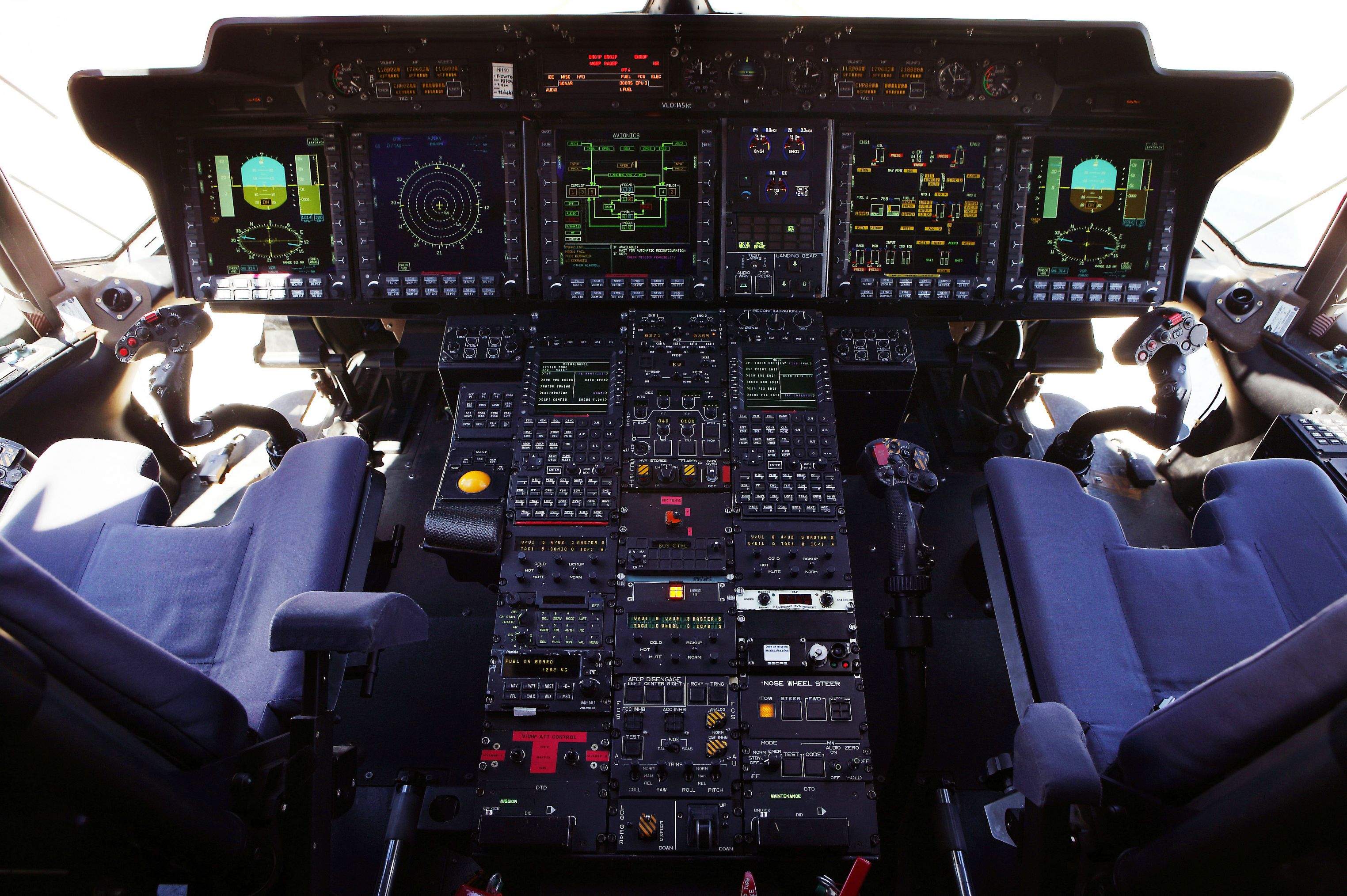 وتحتوي كابينة القيادة على 5 شاشات كريستال سائل 8" * 8" مُلوّنة متعددة المهام لعرض بيانات الطيران والمهام والصيانة ،